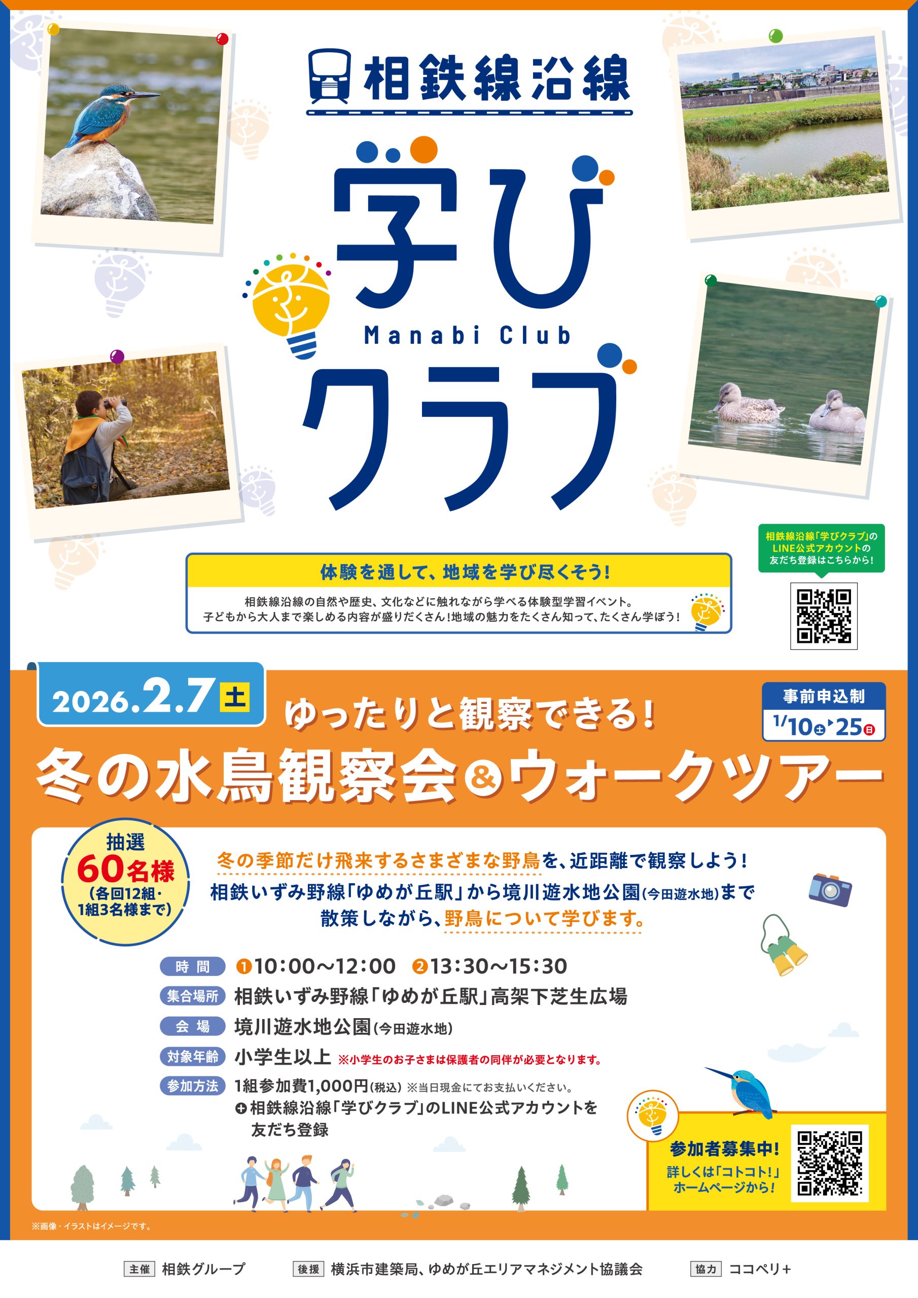 【相鉄線沿線「学びクラブ」】ゆったりと観察できる!冬の水鳥観察会&ウォークツアー 2026年2月7日(土) 2026年1月10日 最終更新日時 : 2025年12月25日 editor お申込みはこちらから