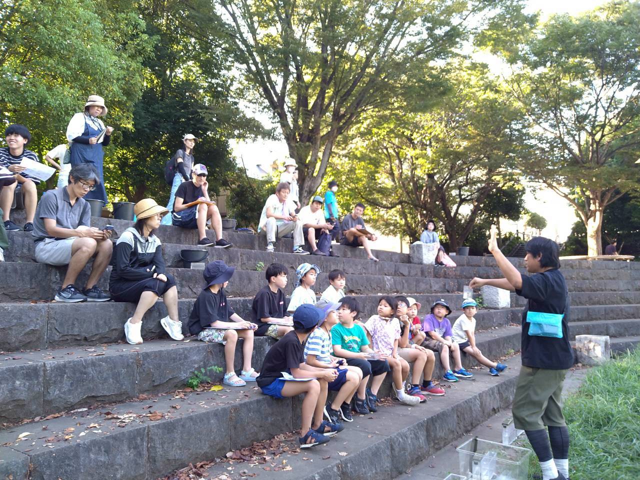 最後は皆で集まって今日採れた生き物の紹介や、外来種の問題や命を大切にすることについて先生からのお話を伺い、子どもたちは真剣な表情で耳を傾けていました。