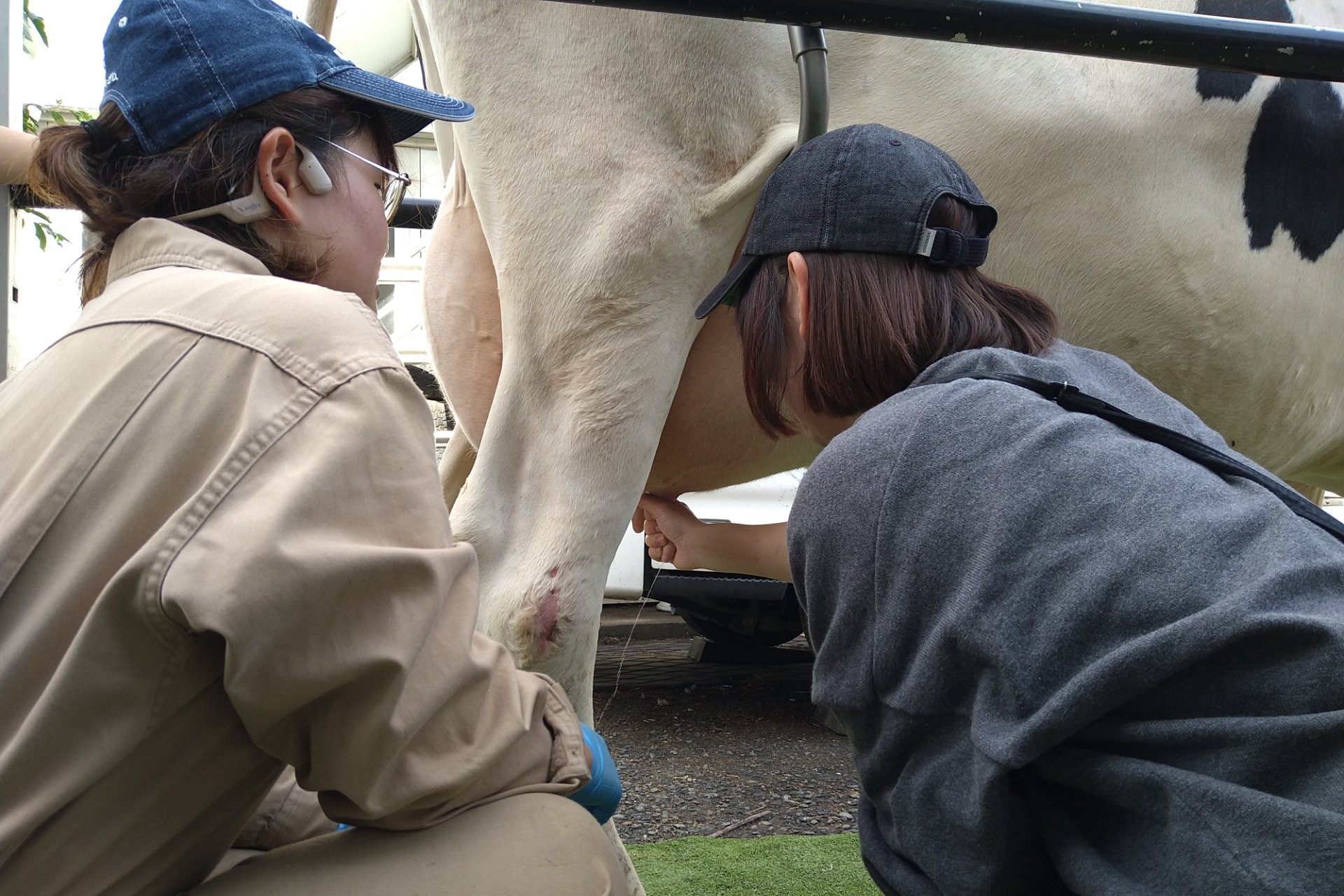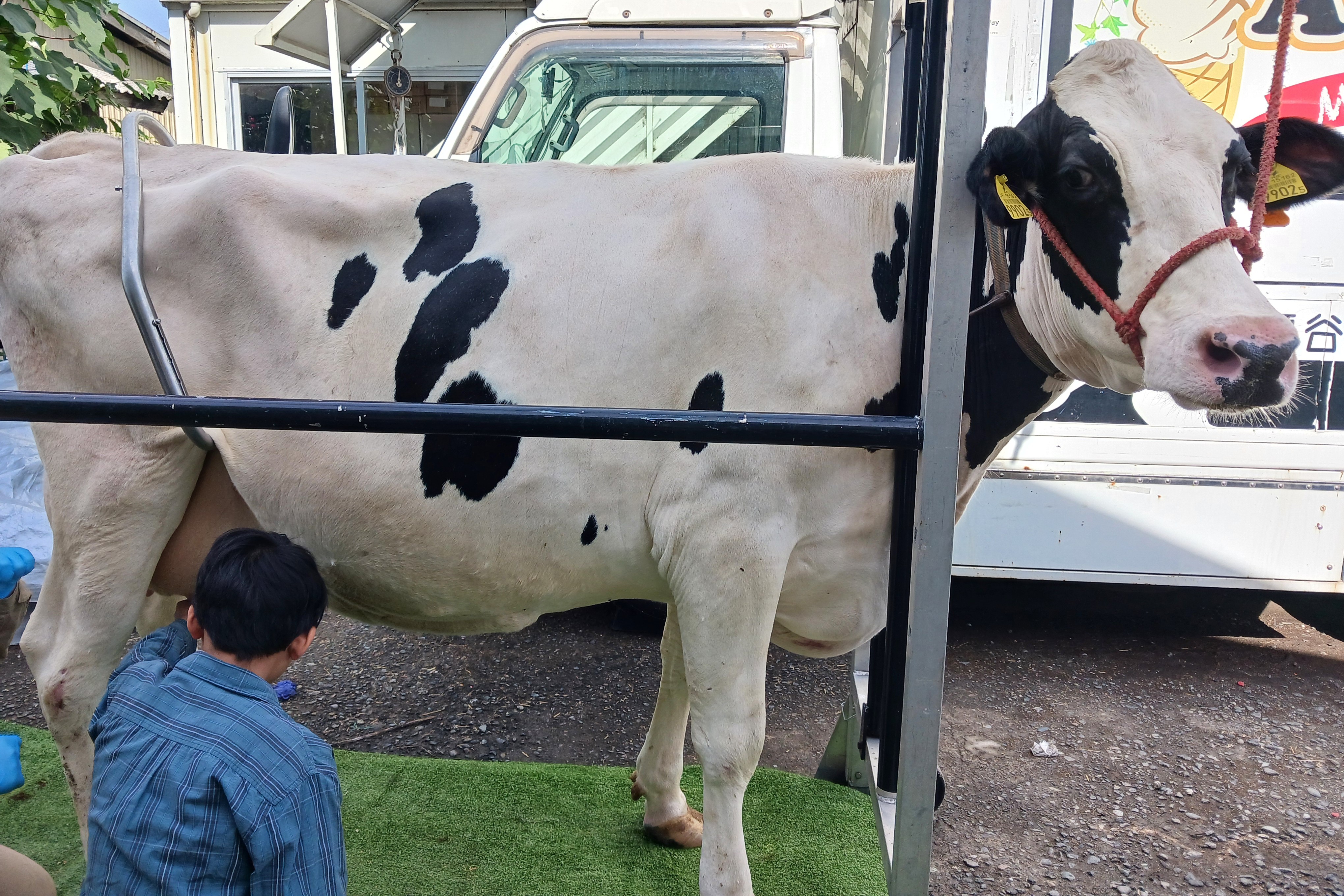 ドキドキしながらみなみちゃんのそばまで近づいて、ゆっくり搾り始めると、勢いよく牛乳が出てきました。
