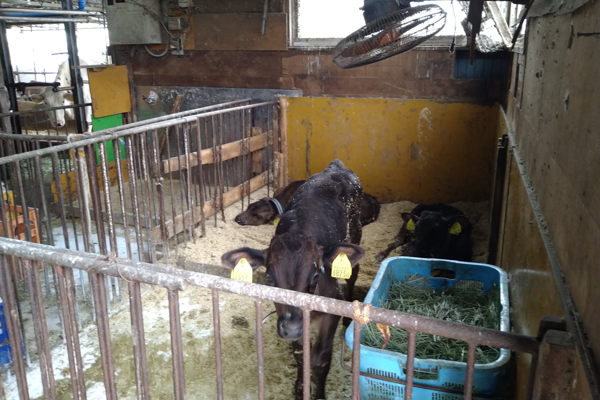 最後は生まれたての子牛が見られる、という事で牛舎の中にも少しお邪魔させていただきました。
