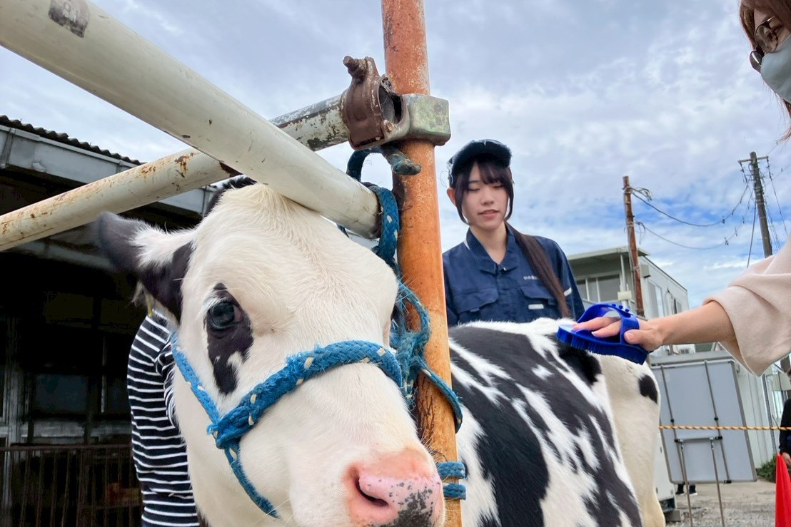 順番にブラシを持って、スタッフさんからブラッシングのコツや、牛さんが喜ぶ場所を聞きながらブラシをかけていきます。牛さんも気持ちよさそう♪
